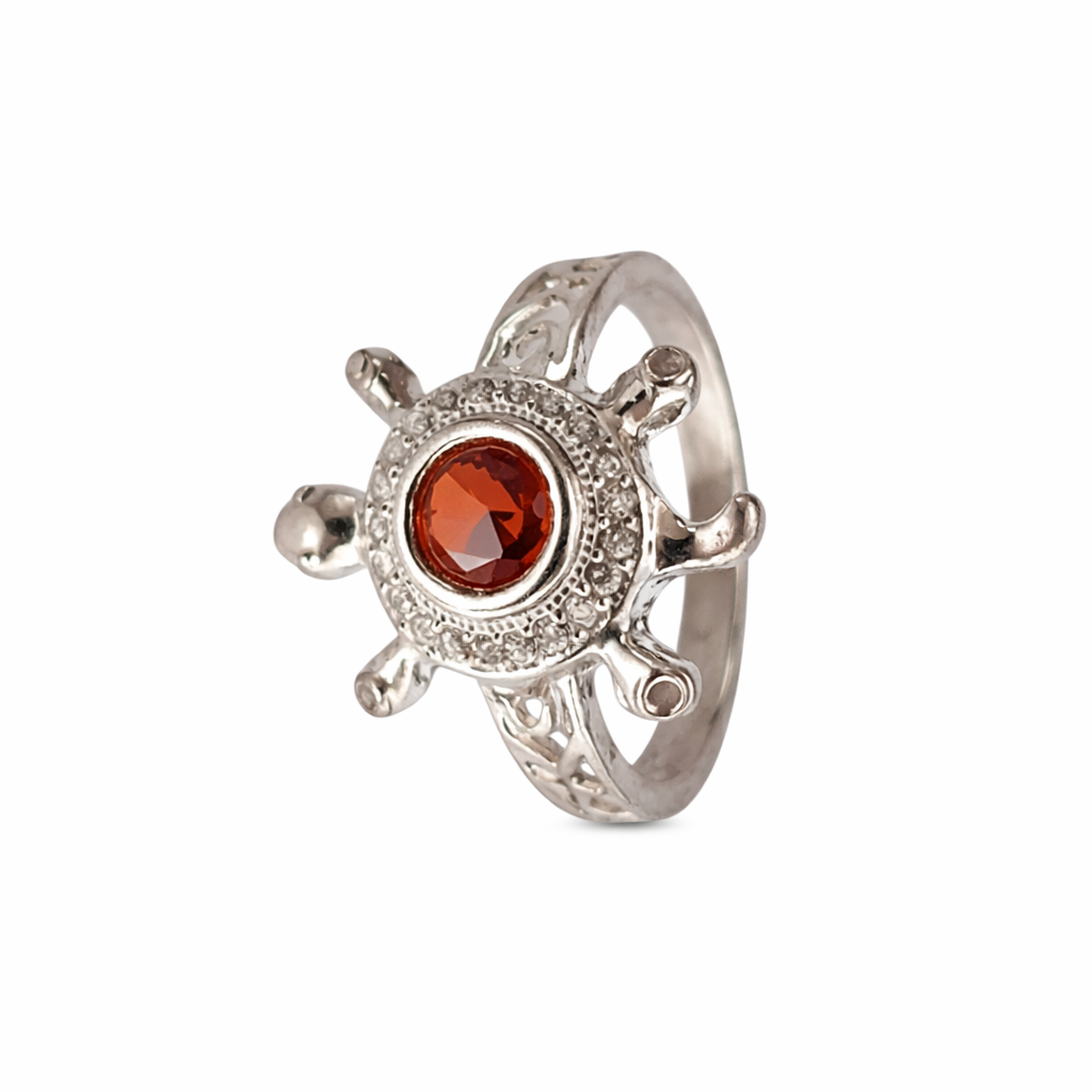 A unique silver ring featuring a turtle-inspired design with a deep red gemstone at the center.